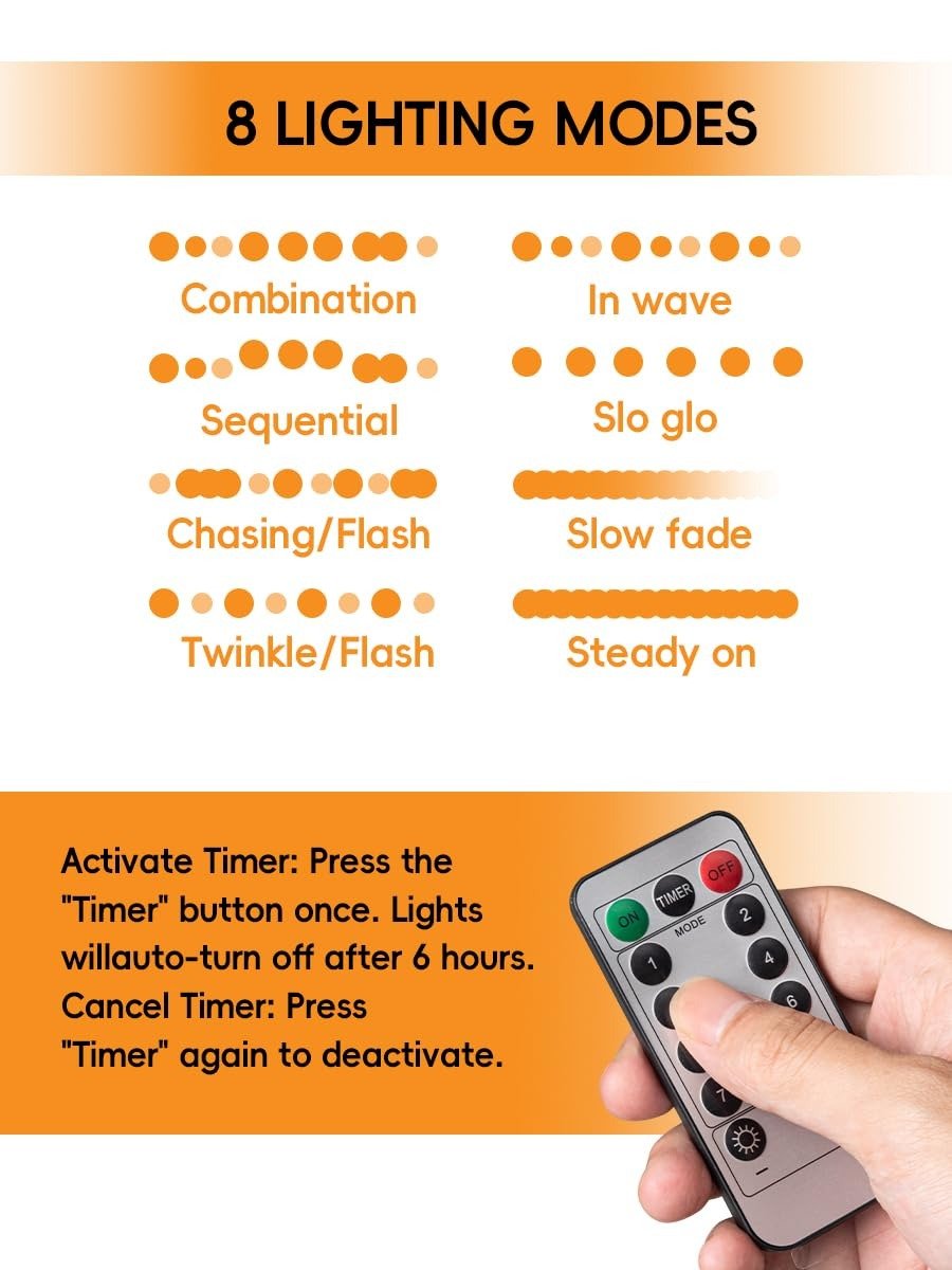 Choose from 8 modes including flashing, fading, waves, and more. Auto-timer runs 6 hours on / 18 hours off for hassle-free holiday fun.
